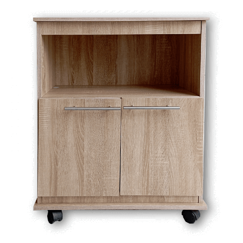 Módulo para microondas con compartimiento inferior para almacenar, 2 puertas abatibles con manijas y bisagras metálicas.